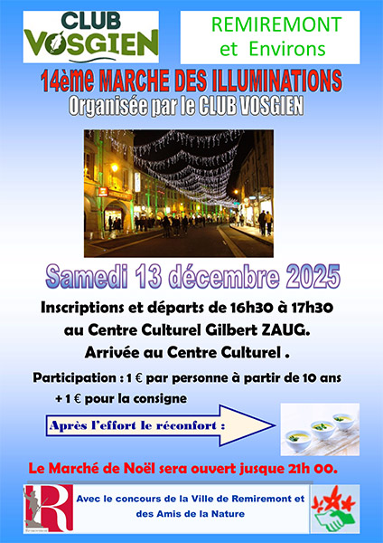 Marche des illuminations de Remiremont organisée par le club Vosgien avec le concours des Amis de la Nature de Remiremont. On vous souhaite nombreux pour venir marcher.