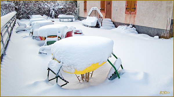 Terrasse de notre chalet de la Beuille. Photo prise le 11 janvier 2026. Qui dit qu’il n’y a pas de neige dans les Vosges..